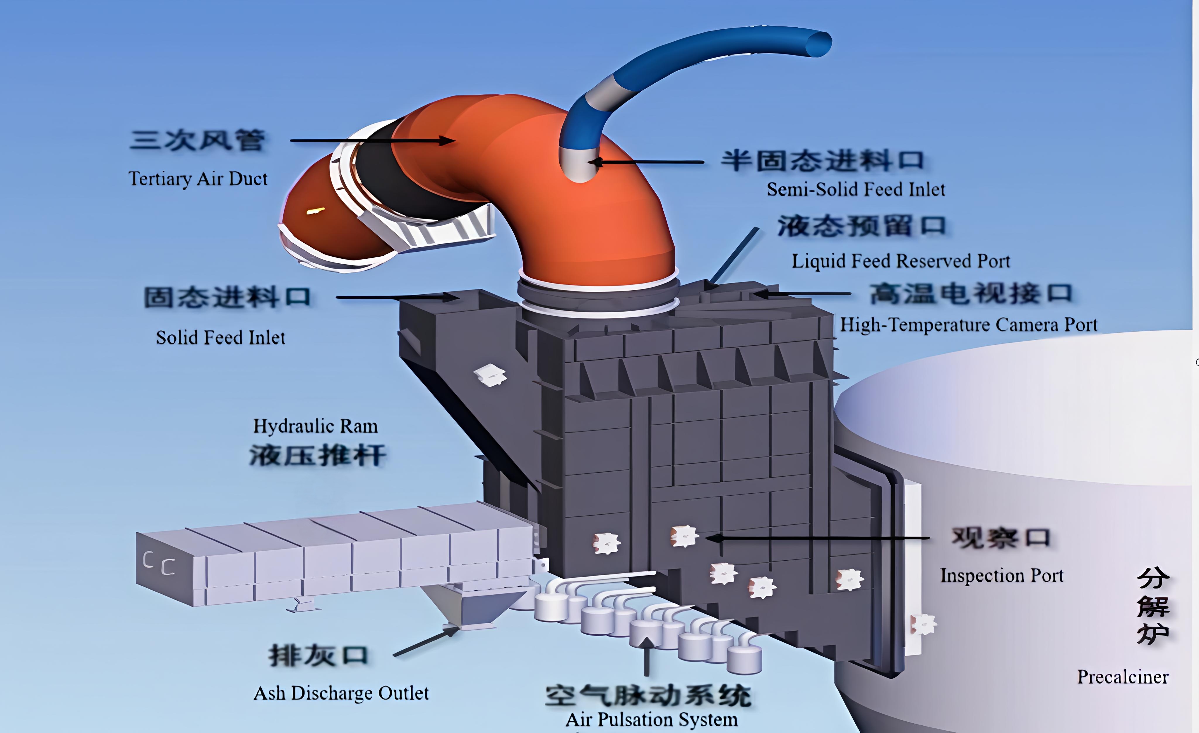 Based on the traditional technology of cement kiln co-processing solid waste (alternative fuel or hazardous waste), the original method of directly feeding solid waste into the calciner is changed to first feeding it into the pre-calciner. After being dried by hot air (tertiary air) and having organic matter burned, the ash residue and flue gas are further fed into the calciner for continued incineration. This further increases the residence time of solid waste in high-temperature incineration inside the cement kiln and significantly improves the high-temperature incineration rate of solid waste. At the same time, it reduces the impact of directly feeding solid waste into the kiln on the quality of cement clinker (such as agglomeration, coating, and yellow-core clinker) and output, and increases the amount of solid waste disposed of by the cement kiln.